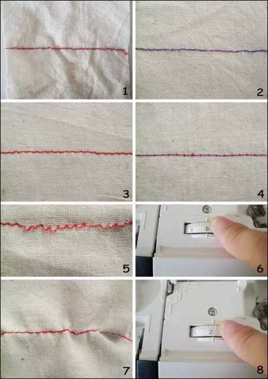 4)縫料皺縮:面、底線張力都過大,兩線的交合點(diǎn)處于縫料之間,但縫料產(chǎn)生皺縮(特別是薄料)和不平直,稍微用力一拉縫料,就會使縫線拉斷。解決方法:減小面線、底線的張力即可。(如圖7、8)